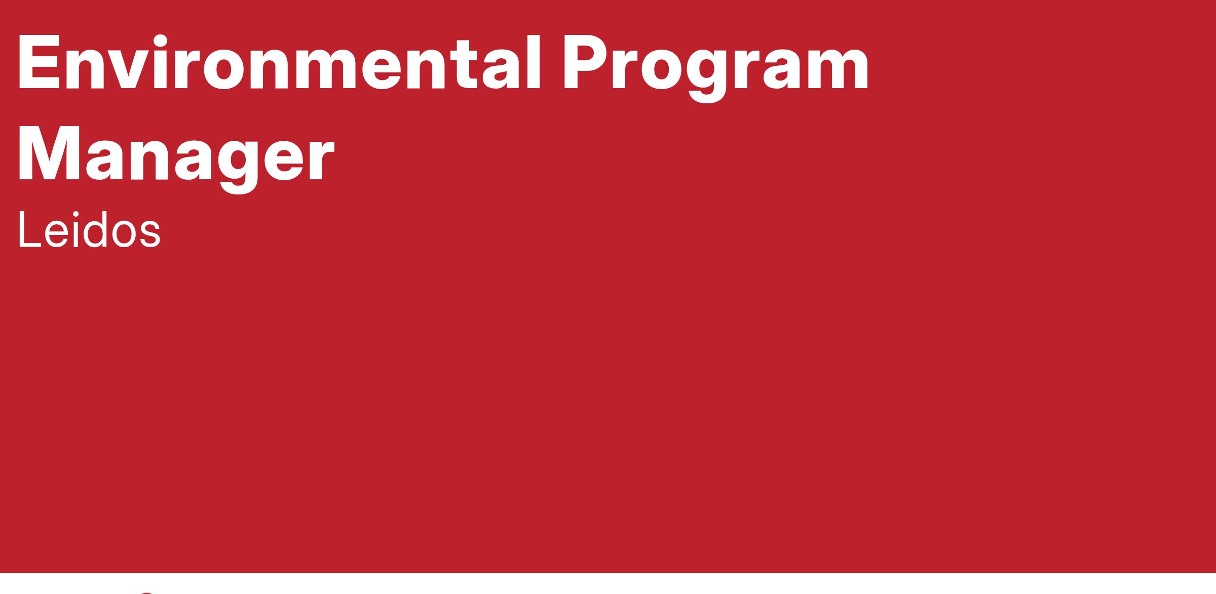 The Environmental Program Manager will routinely interface with Leidos line management, program managers, and senior technical staff across multiple offices, as well as clients and external stakeholders. Applicants should demonstrate excellent written and verbal communication skills and be comfortable working in a team environment. Strong organizational and communication skills are essential.