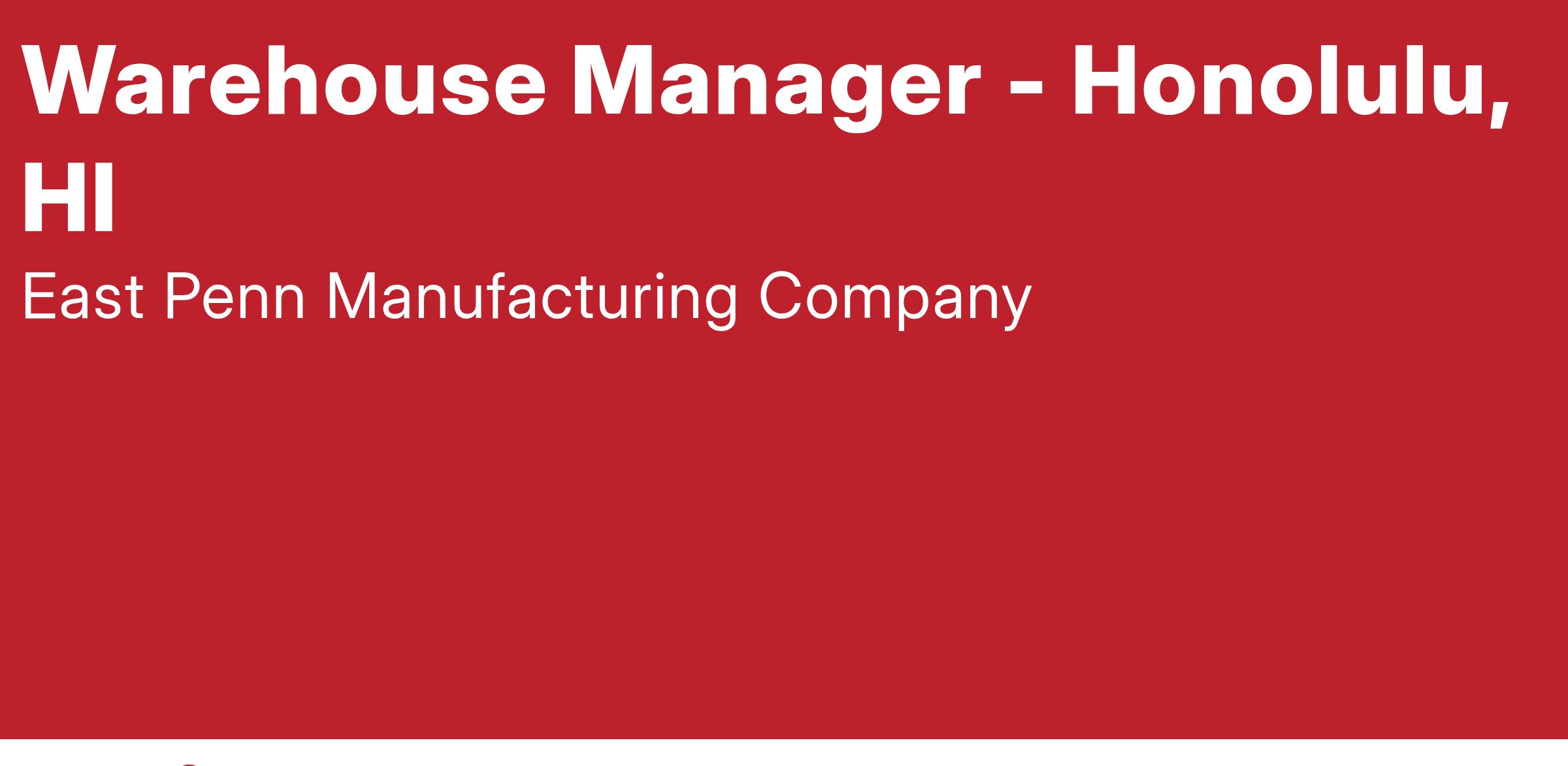 East Penn Manufacturing, a world class leader in automotive battery manufacturing is looking for a Warehouse Manager at our Honolulu, Hawaii warehouse. The Warehouse Manager is responsible for all warehouse activities including all warehouse personnel and distribution/receiving operations. The Warehouse Manager plans and monitors optimal space utilization and efficient inventory flow and manages subordinate staff in the day-to-day performance of their jobs as a true first level manager. Ensures that project/department milestone and goals are met and adhering to approved budgets. The Warehouse Manager is committed to the company’s success while upholding East Penn Company policies and culture.
